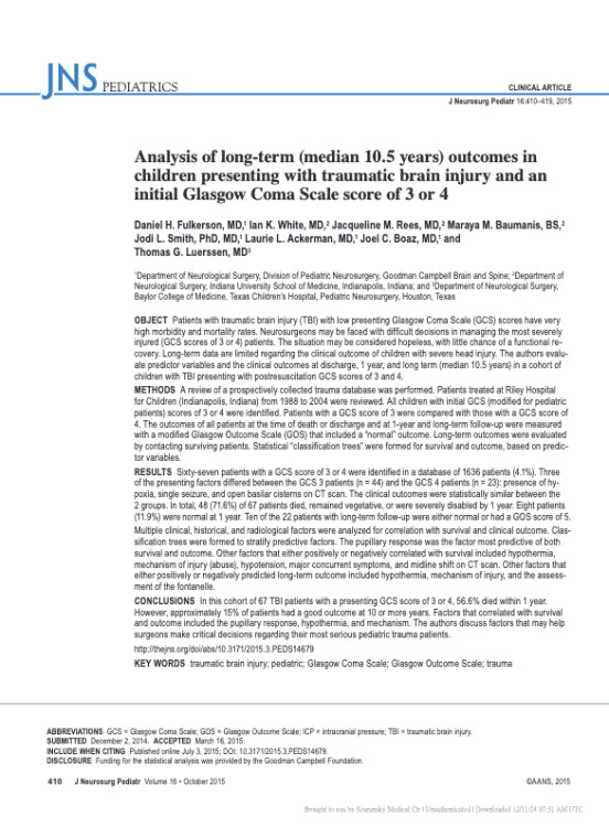 Guidelines for the Management of Pediatric Severe Traumatic Brain Injury, Third Edition: Update of the Brain Trauma Foundation Guidelines, Executive Summary