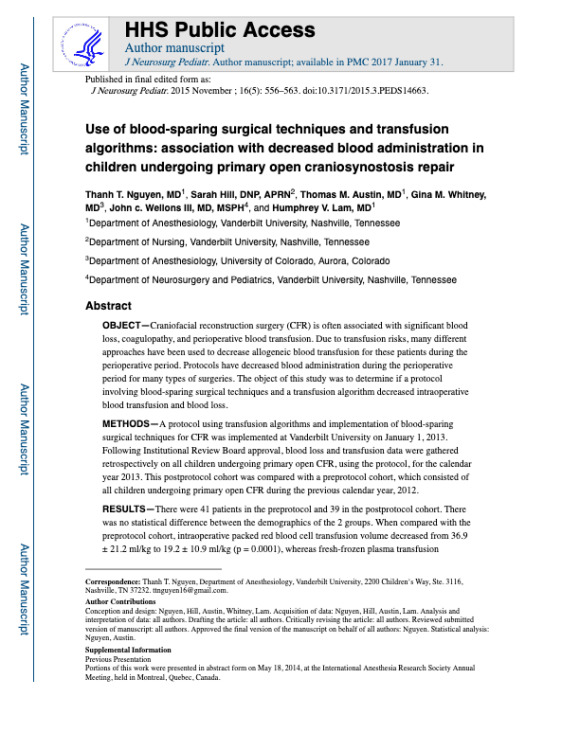 Impact of multidisciplinary engagement in a quality improvement blood conservation protocol for craniosynostosis